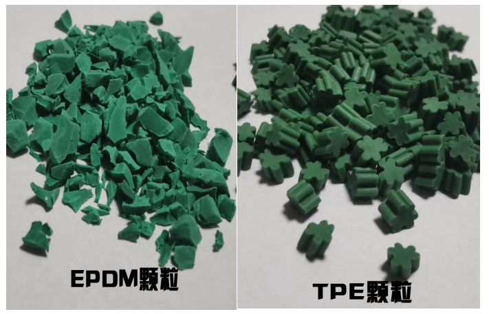 “EPDM顆?!敝饕煞质侨冶z,經過高溫硫化制得,“TPE顆?!庇址Q熱塑性彈性體,可稱為人造橡膠。兩者從形狀上面有著較大差異,“EPDM顆?!背尸F(xiàn)出不規(guī)則形狀、不同大小的顆粒,而“TPE顆?!钡耐庑魏统叽缍际忠恢?。